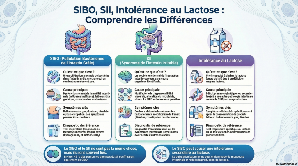 Ces symptômes ressemblent beaucoup à ceux du syndrome de l’intestin irritable (IBS), ce qui explique que de nombreux patients restent longtemps sans diagnostic spécifique de SIBO.